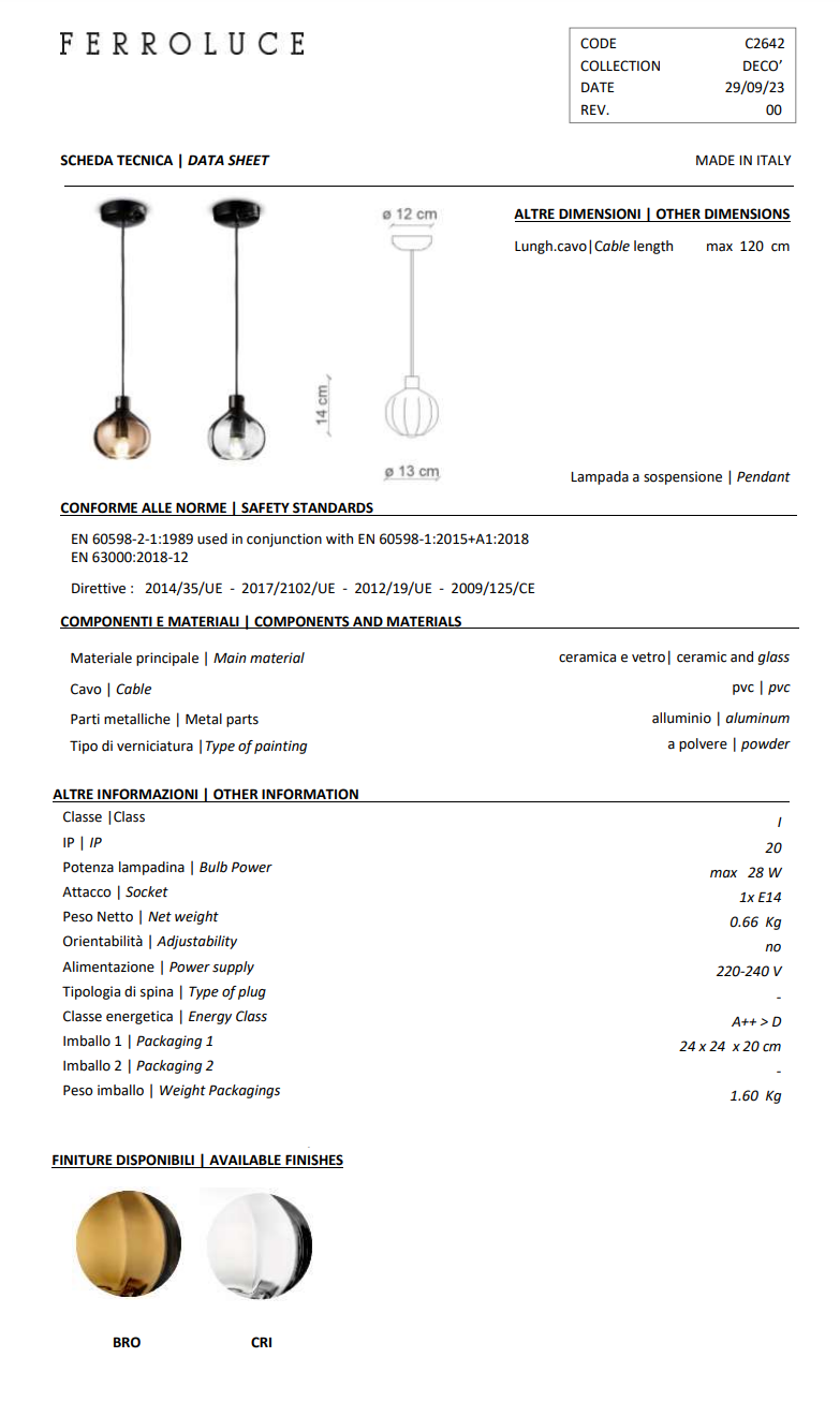 SOSPENSIONE PICCOLA VETRO / SMALL GLASS PENDANT AFOXE' Ferroluce C2642-BRO