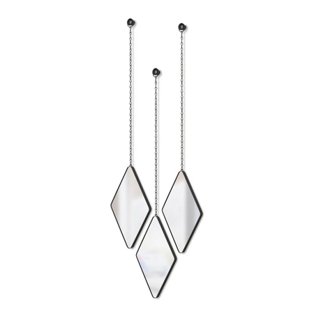UMBRA lustra DIMA DIAMOND czarne.Jest to zestaw trzech małych lusterek, wykonanych na kształt diamentu.Można je zamontować wedle własnego uznania, wszystkie trzy obok siebie, lub oddzielnie w różnych konfiguracjach.Będzie to świetna dekoracja ścienna do naszej sypialni lub przedpokoju.Całość zamocowana jest na łańcuszku przymocowanym prętem o zaokrąglonej końcówce.Wymiary: wys. 29 cm / szer. 17 cm / gł. 1 cmWaga netto: 1 kg.