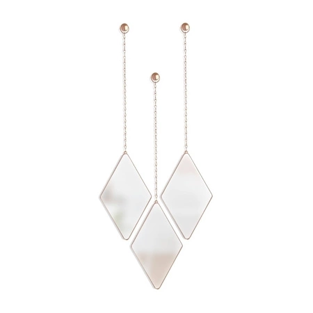 UMBRA lustra DIMA DIAMOND miedziane.Jest to zestaw trzech małych lusterek, wykonanych na kształt diamentu.Można je zamontować wedle własnego uznania, wszystkie trzy obok siebie, lub oddzielnie w różnych konfiguracjach.Będzie to świetna dekoracja ścienna do naszej sypialni lub przedpokoju.Całość zamocowana jest na łańcuszku przymocowanym prętem o zaokrąglonej końcówce.Wymiary: wys. 29 cm / szer. 17 cm / gł. 1 cmWaga netto: 1 kg.