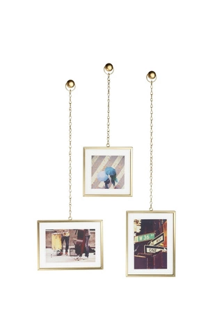 UMBRA ramka na zdjęcia FOTOCHAIN w kolorze złota.Zawiera trzy wiszące ramki w stylu galerii. Jedna kwadratowa i dwie prostokątne, każda zawieszona na solidnym metalowym łańcuszku, który jest przymocowany do pasującego kolorystycznie mocowania naściennego. Konfiguracja zdjęć jest dowolna, możemy je wieszać w pionie i w poziomie.Wymiar zdjęć do ramek: 10 cm x 15 cmWaga: 1,24 kg.