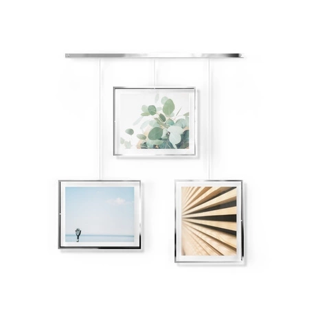 UMBRA ramki na zdjęcia EXHIBIT - chromowane.Stwórz własną, unikalną galerię, dzięki ramkom do zdjęć Exhibit. Jest to zestaw trzech ramek, które można zamocować na ścianie za pomocą metalowych prętów.Konfiguracja ułożenie zdjęć zależy tylko od nas. Zdjęcia można regulować za pomocą ruchomej prowadnicy, tak aby, jak najlepiej pasowały do każdej aranżacji.Wymiary zdjęć do ramek: 13 × 18 cmWaga: 2,9 kg.