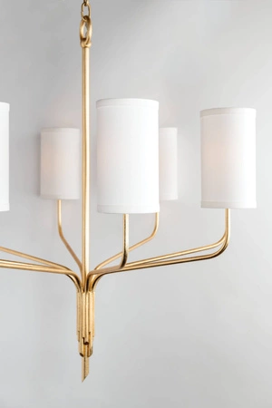 - Żyrandol JUNIPER wyróżnia się eleganckim, złotym wykończeniem, które w połączeniu z białymi abażurami z tkaniny nadaje wnętrzu luksusowy i wyrafinowany wygląd.